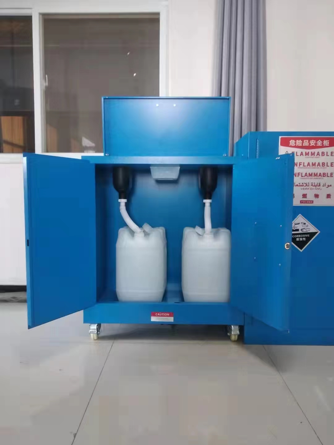 3、特制废液专用门设计:专业在产品顶部特制倾倒门,倾倒门采用无钥匙锁、液压杆开启设计,方便使用者轻松随时打开柜门,便于废液的倒入。